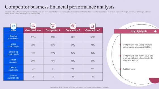 This slide outlines financial comparison and analysis of own business and other business operating in similar industrymarket. It assess performance based on revenue, gross profit margin, operating profit margin, return on equity, debt to equity ratio and price to earnings ratio. Do you have an important presentation coming up Are you looking for something that will make your presentation stand out from the rest Look no further than Competitor Business Financial Performance Analysis Ppt Slides Display Pdf. With our professional designs, you can trust that your presentation will pop and make delivering it a smooth process. And with Slidegeeks, you can trust that your presentation will be unique and memorable. So why wait Grab Competitor Business Financial Performance Analysis Ppt Slides Display Pdf today and make your presentation stand out from the rest This slide outlines financial comparison and analysis of own business and other business operating in similar industrymarket. It assess performance based on revenue, gross profit margin, operating profit margin, return on equity, debt to equity ratio and price to earnings ratio.