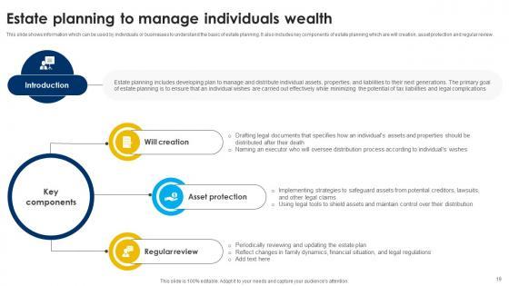 This slide shows information which can be used by individuals or businesses to understand the basic of estate planning. It also includes key components of estate planning which are will creation, asset protection and regular review. Whether you have daily or monthly meetings, a brilliant presentation is necessary. Estate Planning To Manage Individuals Wealth Strategic Wealth Management And Financial Fin SS V can be your best option for delivering a presentation. Represent everything in detail using Estate Planning To Manage Individuals Wealth Strategic Wealth Management And Financial Fin SS V and make yourself stand out in meetings. The template is versatile and follows a structure that will cater to your requirements. All the templates prepared by Slidegeeks are easy to download and edit. Our research experts have taken care of the corporate themes as well. So, give it a try and see the results. This slide shows information which can be used by individuals or businesses to understand the basic of estate planning. It also includes key components of estate planning which are will creation, asset protection and regular review.