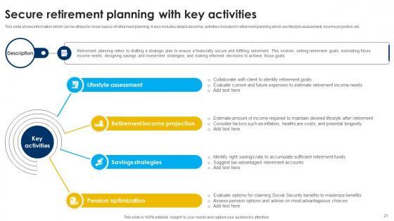 This slide shows information which can be utilized to know basics of retirement planning. It also includes details about key activities included in retirement planning which are lifestyle assessment, income projection, etc. Get a simple yet stunning designed Secure Retirement Planning With Key Activities Strategic Wealth Management And Financial Fin SS V. It is the best one to establish the tone in your meetings. It is an excellent way to make your presentations highly effective. So, download this PPT today from Slidegeeks and see the positive impacts. Our easy-to-edit Secure Retirement Planning With Key Activities Strategic Wealth Management And Financial Fin SS V can be your go-to option for all upcoming conferences and meetings. So, what are you waiting for. Grab this template today. This slide shows information which can be utilized to know basics of retirement planning. It also includes details about key activities included in retirement planning which are lifestyle assessment, income projection, etc.