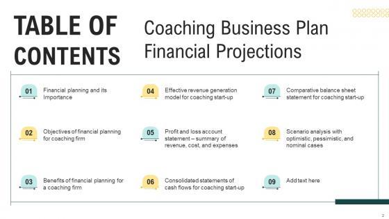 From laying roadmaps to briefing everything in detail, our templates are perfect for you. You can set the stage with your presentation slides. All you have to do is download these easy-to-edit and customizable templates. Table Of Contents Coaching Business Plan Financial Projections Pictures Pdf will help you deliver an outstanding performance that everyone would remember and praise you for. Do download this presentation today. Our Table Of Contents Coaching Business Plan Financial Projections Pictures Pdf are topically designed to provide an attractive backdrop to any subject. Use them to look like a presentation pro.