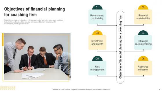 The slide highlights key objectives of financial planning and helps company in analyzing its current monetary condition and your future expectations. It includes profit maximization, wealth generation etc. There are so many reasons you need a Objectives Of Financial Planning Coaching Business Plan Financial Projections Guidelines Pdf. The first reason is you can not spend time making everything from scratch, Thus, Slidegeeks has made presentation templates for you too. You can easily download these templates from our website easily. The slide highlights key objectives of financial planning and helps company in analyzing its current monetary condition and your future expectations. It includes profit maximization, wealth generation etc.