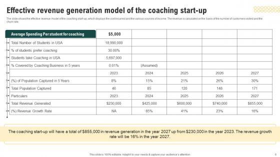 The slide shows the effective revenue model of the coaching start-up, which displays the cost incurred and the various sources of income. The revenue is calculated on the basis of the number of customers visited and the churn rate. Slidegeeks is one of the best resources for PowerPoint templates. You can download easily and regulate Effective Revenue Generation Model Coaching Business Plan Financial Projections Themes Pdf for your personal presentations from our wonderful collection. A few clicks is all it takes to discover and get the most relevant and appropriate templates. Use our Templates to add a unique zing and appeal to your presentation and meetings. All the slides are easy to edit and you can use them even for advertisement purposes. The slide shows the effective revenue model of the coaching start-up, which displays the cost incurred and the various sources of income. The revenue is calculated on the basis of the number of customers visited and the churn rate.