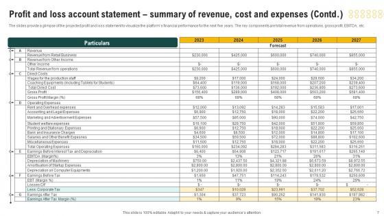 The slides provide a glimpse of the projected profit and loss statement to visualize the platforms financial performance for the next five years. The key components are total revenue from operations, gross profit, EBITDA, etc. Do you have to make sure that everyone on your team knows about any specific topic I yes, then you should give Profit And Loss Account Statement Summary Coaching Business Plan Financial Projections Clipart Pdf a try. Our experts have put a lot of knowledge and effort into creating this impeccable Profit And Loss Account Statement Summary Coaching Business Plan Financial Projections Clipart Pdf. You can use this template for your upcoming presentations, as the slides are perfect to represent even the tiniest detail. You can download these templates from the Slidegeeks website and these are easy to edit. So grab these today The slides provide a glimpse of the projected profit and loss statement to visualize the platforms financial performance for the next five years. The key components are total revenue from operations, gross profit, EBITDA, etc.