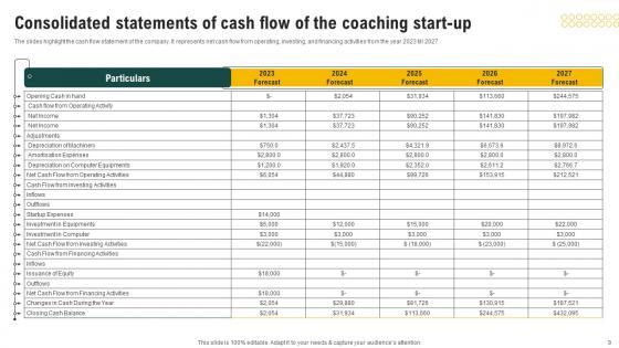 The slides highlight the cash flow statement of the company. It represents net cash flow from operating, investing, and financing activities from the year 2023 till 2027. Create an editable Consolidated Statements Of Cash Flow Coaching Business Plan Financial Projections Introduction Pdf that communicates your idea and engages your audience. Whether you are presenting a business or an educational presentation, pre-designed presentation templates help save time. Consolidated Statements Of Cash Flow Coaching Business Plan Financial Projections Introduction Pdf is highly customizable and very easy to edit, covering many different styles from creative to business presentations. Slidegeeks has creative team members who have crafted amazing templates. So, go and get them without any delay. The slides highlight the cash flow statement of the company. It represents net cash flow from operating, investing, and financing activities from the year 2023 till 2027.