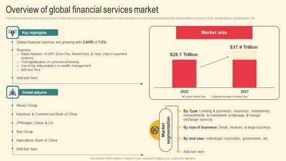 This slide provides glimpse about summary of international banking and finance business for understanding its growing market and utilizing the opportunities. It includes CAGR, growth drivers, global players, etc. Get a simple yet stunning designed Overview Of Global Financial Planning Outreach Campaigns PPT PowerPoint. It is the best one to establish the tone in your meetings. It is an excellent way to make your presentations highly effective. So, download this PPT today from Slidegeeks and see the positive impacts. Our easy-to-edit Overview Of Global Financial Planning Outreach Campaigns PPT PowerPoint can be your go-to option for all upcoming conferences and meetings. So, what are you waiting for Grab this template today. This slide provides glimpse about summary of international banking and finance business for understanding its growing market and utilizing the opportunities. It includes CAGR, growth drivers, global players, etc.