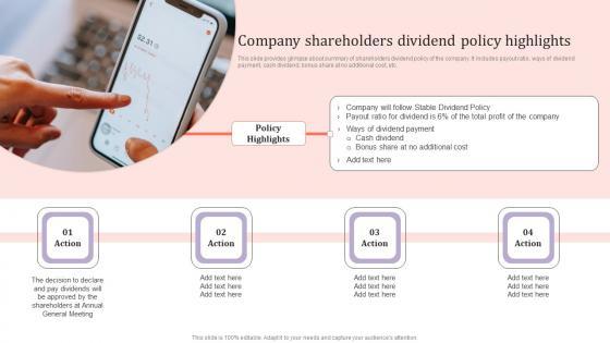 This slide provides glimpse about summary of shareholders dividend policy of the company. It includes payout ratio, ways of dividend payment, cash dividend, bonus share at no additional cost, etc. If you are looking for a format to display your unique thoughts, then the professionally designed Strategic Financial Planning And Administration Company Shareholders Dividend Policy Highlights Guidelines PDF is the one for you. You can use it as a Google Slides template or a PowerPoint template. Incorporate impressive visuals, symbols, images, and other charts. Modify or reorganize the text boxes as you desire. Experiment with shade schemes and font pairings. Alter, share or cooperate with other people on your work. Download Strategic Financial Planning And Administration Company Shareholders Dividend Policy Highlights Guidelines PDF and find out how to give a successful presentation. Present a perfect display to your team and make your presentation unforgettable. This slide provides glimpse about summary of shareholders dividend policy of the company. It includes payout ratio, ways of dividend payment, cash dividend, bonus share at no additional cost, etc.