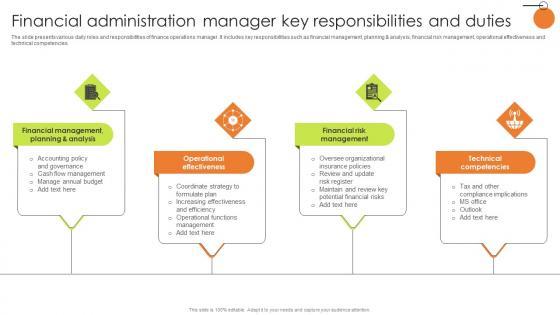 The slide presents various daily roles and responsibilities of finance operations manager. It includes key responsibilities such as financial management, planning and analysis, financial risk management, operational effectiveness and technical competencies. Pitch your topic with ease and precision using this Financial Administration Manager Key Responsibilities And Duties Portrait Pdf. This layout presents information on Financial Management, Operational Effectiveness, Financial Risk Management. It is also available for immediate download and adjustment. So, changes can be made in the color, design, graphics or any other component to create a unique layout. The slide presents various daily roles and responsibilities of finance operations manager. It includes key responsibilities such as financial management, planning and analysis, financial risk management, operational effectiveness and technical competencies.