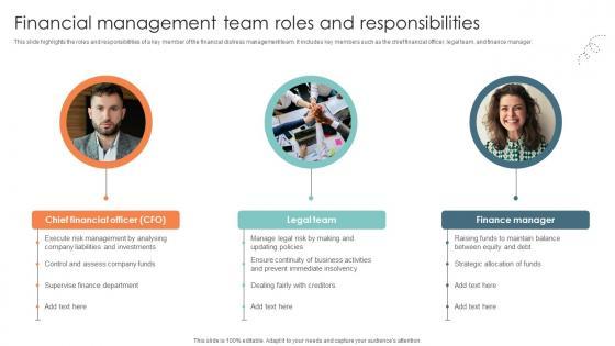 This slide highlights the roles and responsibilities of a key member of the financial distress management team. It includes key members such as the chief financial officer, legal team, and finance manager. Slidegeeks is here to make your presentations a breeze with Financial Management Team Roles And Responsibilities Strategic Approaches To Corporate Financial With our easy-to-use and customizable templates, you can focus on delivering your ideas rather than worrying about formatting. With a variety of designs to choose from, you are sure to find one that suits your needs. And with animations and unique photos, illustrations, and fonts, you can make your presentation pop. So whether you are giving a sales pitch or presenting to the board, make sure to check out Slidegeeks first This slide highlights the roles and responsibilities of a key member of the financial distress management team. It includes key members such as the chief financial officer, legal team, and finance manager.