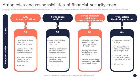 The following slide Major roles and responsibilities of financial security department. It includes information about risk level determination, laws and regulations, team training, operational compliance, automatic workflows, red flags, etc. The best PPT templates are a great way to save time, energy, and resources. Slidegeeks have 100 percent editable powerpoint slides making them incredibly versatile. With these quality presentation templates, you can create a captivating and memorable presentation by combining visually appealing slides and effectively communicating your message. Download Integrating AML And Transaction Major Roles And Responsibilities Of Financial Sample PDF from Slidegeeks and deliver a wonderful presentation.