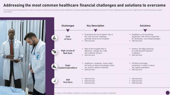 The following slide showcases the most common types of financial issues faced by the healthcare companies along with the solutions to overcome. The key challenges are cost of care, high levels of bad debt and huge capital expenditure. Slidegeeks is here to make your presentations a breeze with Guide To Healthcare Services Administration Addressing The Most Common Healthcare Financial Challenges Formats PDF With our easy to use and customizable templates, you can focus on delivering your ideas rather than worrying about formatting. With a variety of designs to choose from, you are sure to find one that suits your needs. And with animations and unique photos, illustrations, and fonts, you can make your presentation pop. So whether you are giving a sales pitch or presenting to the board, make sure to check out Slidegeeks first.