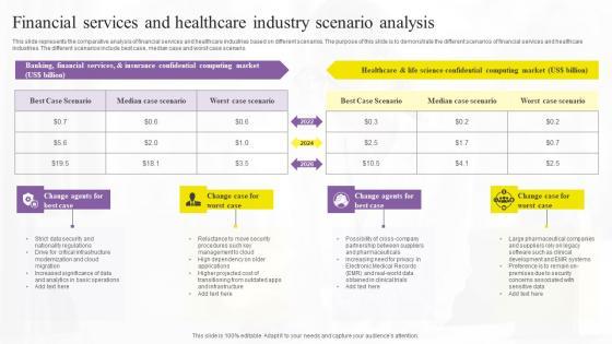 This slide represents the comparative analysis of financial services and healthcare industries based on different scenarios. The purpose of this slide is to demonstrate the different scenarios of financial services and healthcare industries. The different scenarios include best case, median case and worst case scenario. Here you can discover an assortment of the finest PowerPoint and Google Slides templates. With these templates, you can create presentations for a variety of purposes while simultaneously providing your audience with an eye-catching visual experience. Download Financial Services And Healthcare Confidential Computing Technologies Demonstration Pdf to deliver an impeccable presentation. These templates will make your job of preparing presentations much quicker, yet still, maintain a high level of quality. Slidegeeks has experienced researchers who prepare these templates and write high-quality content for you. Later on, you can personalize the content by editing the Financial Services And Healthcare Confidential Computing Technologies Demonstration Pdf. This slide represents the comparative analysis of financial services and healthcare industries based on different scenarios. The purpose of this slide is to demonstrate the different scenarios of financial services and healthcare industries. The different scenarios include best case, median case and worst case scenario.