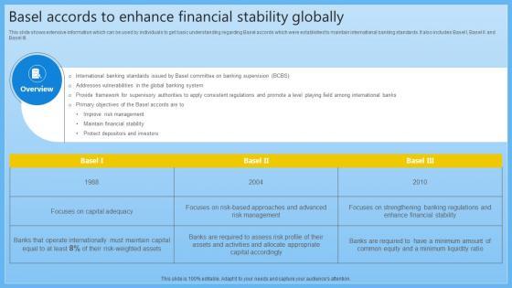 This slide shows extensive information which can be used by individuals to get basic understanding regarding Basel accords which were established to maintain international banking standards. It also includes Basel I, Basel II and Basel III. Present like a pro with Basel Accords To Enhance Financial Stability Globally Complete Guide On Managing Banking Fin SS V. Create beautiful presentations together with your team, using our easy-to-use presentation slides. Share your ideas in real-time and make changes on the fly by downloading our templates. So whether you are in the office, on the go, or in a remote location, you can stay in sync with your team and present your ideas with confidence. With Slidegeeks presentation got a whole lot easier. Grab these presentations today. This slide shows extensive information which can be used by individuals to get basic understanding regarding Basel accords which were established to maintain international banking standards. It also includes Basel I, Basel II and Basel III.
