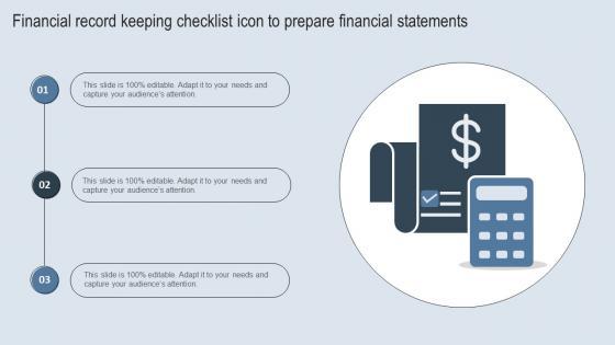 Showcasing this set of slides titled Financial Record Keeping Checklist Icon To Prepare Financial Statements Inspiration Pdf. The topics addressed in these templates are Financial Record Keeping Checklist, Prepare Financial Statements. All the content presented in this PPT design is completely editable. Download it and make adjustments in color, background, font etc. as per your unique business setting. Our Financial Record Keeping Checklist Icon To Prepare Financial Statements Inspiration Pdf are topically designed to provide an attractive backdrop to any subject. Use them to look like a presentation pro.
