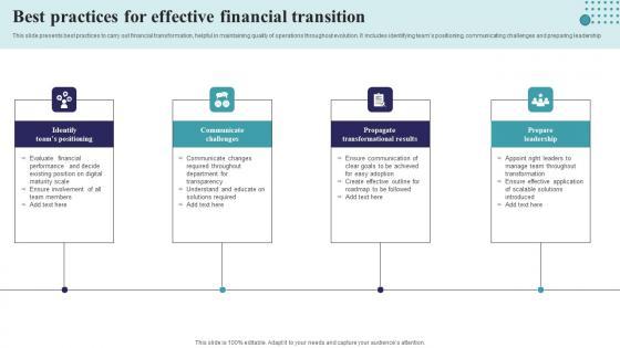 This slide presents best practices to carry out financial transformation, helpful in maintaining quality of operations throughout evolution. It includes identifying teams positioning, communicating challenges and preparing leadership Showcasing this set of slides titled Best Practices For Effective Financial Transition Topics Pdf The topics addressed in these templates are Communicate Challenges, Propagate Transformational Results All the content presented in this PPT design is completely editable. Download it and make adjustments in color, background, font etc. as per your unique business setting. This slide presents best practices to carry out financial transformation, helpful in maintaining quality of operations throughout evolution. It includes identifying teams positioning, communicating challenges and preparing leadership
