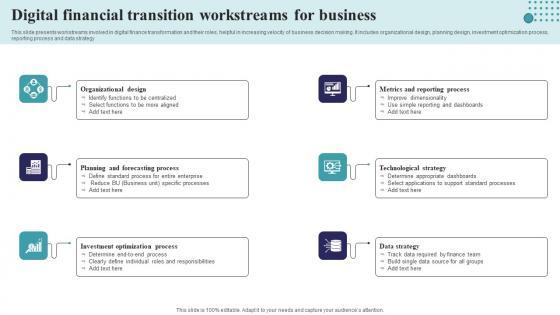 This slide presents workstreams involved in digital finance transformation and their roles, helpful in increasing velocity of business decision making. It includes organizational design, planning design, investment optimization process, reporting process and data strategy Pitch your topic with ease and precision using this Digital Financial Transition Workstreams For Business Infographics Pdf This layout presents information on Organizational Design, Planning And Forecasting Process It is also available for immediate download and adjustment. So, changes can be made in the color, design, graphics or any other component to create a unique layout. This slide presents workstreams involved in digital finance transformation and their roles, helpful in increasing velocity of business decision making. It includes organizational design, planning design, investment optimization process, reporting process and data strategy