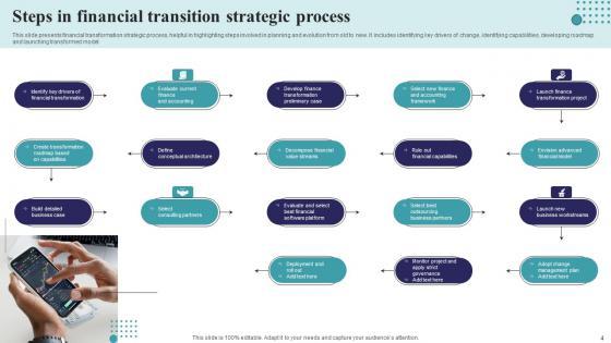 This slide presents financial transformation strategic process, helpful in highlighting steps involved in planning and evolution from old to new. It includes identifying key drivers of change, identifying capabilities, developing roadmap and launching transformed model Showcasing this set of slides titled Steps In Financial Transition Strategic Process Information Pdf The topics addressed in these templates are Decompose Financial, Software Platform, Business Partners All the content presented in this PPT design is completely editable. Download it and make adjustments in color, background, font etc. as per your unique business setting. This slide presents financial transformation strategic process, helpful in highlighting steps involved in planning and evolution from old to new. It includes identifying key drivers of change, identifying capabilities, developing roadmap and launching transformed model