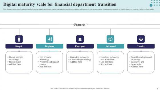 This slide presents digital maturity scale for financial department transformation that helps in improving operational efficiency and revenue generation. It includes stages such as skeptic, beginner, emergent, advanced and leader. Persuade your audience using this Digital Advancement Scale For Financial Department Transition Elements PDF. This PPT design covers five stages, thus making it a great tool to use. It also caters to a variety of topics including Skeptic, Beginner, Emergent, Advanced, Leader. Download this PPT design now to present a convincing pitch that not only emphasizes the topic but also showcases your presentation skills.
