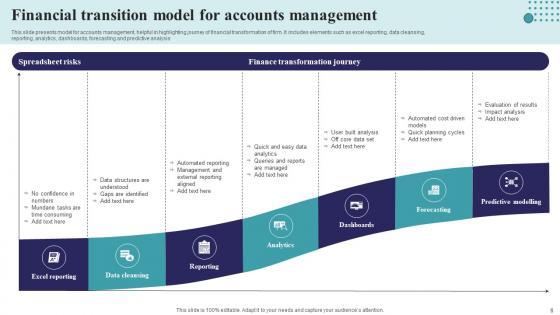 This slide presents model for accounts management, helpful in highlighting journey of financial transformation of firm. It includes elements such as excel reporting, data cleansing, reporting, analytics, dashboards, forecasting and predictive analysis Pitch your topic with ease and precision using this Financial Transition Model For Accounts Management Structure Pdf This layout presents information on Excel Reporting, Data Cleansing, Reporting, Analytics It is also available for immediate download and adjustment. So, changes can be made in the color, design, graphics or any other component to create a unique layout. This slide presents model for accounts management, helpful in highlighting journey of financial transformation of firm. It includes elements such as excel reporting, data cleansing, reporting, analytics, dashboards, forecasting and predictive analysis
