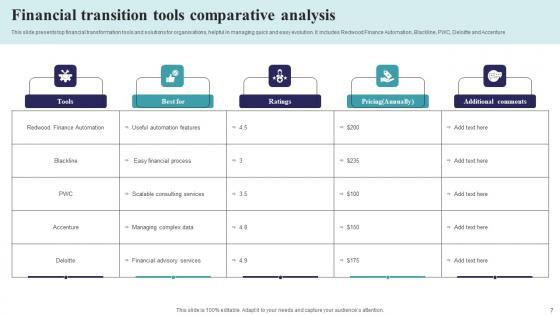 This slide presents top financial transformation tools and solutions for organisations, helpful in managing quick and easy evolution. It includes Redwood Finance Automation, Blackline, PWC, Deloitte and Accenture Pitch your topic with ease and precision using this Financial Transition Tools Comparative Analysis Infographics Pdf This layout presents information on Redwood Finance Automation, Financial Process It is also available for immediate download and adjustment. So, changes can be made in the color, design, graphics or any other component to create a unique layout. This slide presents top financial transformation tools and solutions for organisations, helpful in managing quick and easy evolution. It includes Redwood Finance Automation, Blackline, PWC, Deloitte and Accenture