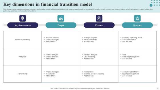 This slide presents main dimensions of financial transformation model, helpful in highlighting main areas of opportunity to be enhanced. It includes people, process and systems that are to be improved with respect to business partnering, analytical and transactional functions Showcasing this set of slides titled Key Dimensions In Financial Transition Model Graphics Pdf The topics addressed in these templates are Business Partnering, Process, Key Focus Areas All the content presented in this PPT design is completely editable. Download it and make adjustments in color, background, font etc. as per your unique business setting. This slide presents main dimensions of financial transformation model, helpful in highlighting main areas of opportunity to be enhanced. It includes people, process and systems that are to be improved with respect to business partnering, analytical and transactional functions