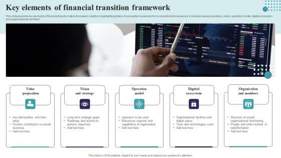 This slide presents key elements of financial transformation framework, helpful in highlighting pillars of successful conversion from conventional to advanced. It includes value proposition, vision, operation model, digital ecosystem and organisational members Pitch your topic with ease and precision using this Key Elements Of Financial Transition Framework Summary Pdf This layout presents information on Value Proposition, Vision And Strategy, Operation Model It is also available for immediate download and adjustment. So, changes can be made in the color, design, graphics or any other component to create a unique layout. This slide presents key elements of financial transformation framework, helpful in highlighting pillars of successful conversion from conventional to advanced. It includes value proposition, vision, operation model, digital ecosystem and organisational members
