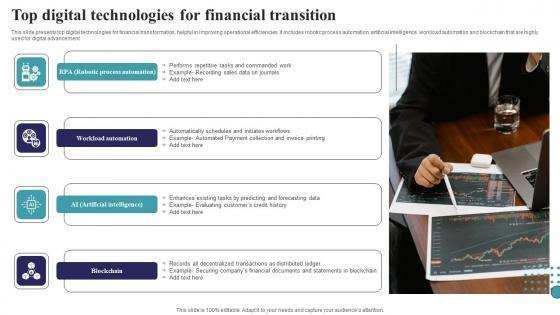 This slide presents top digital technologies for financial transformation, helpful in improving operational efficiencies. It includes robotic process automation, artificial intelligence, workload automation and blockchain that are highly used for digital advancement Pitch your topic with ease and precision using this Top Digital Technologies For Financial Transition Clipart Pdf This layout presents information on Robotic Process Automation, Workload Automation It is also available for immediate download and adjustment. So, changes can be made in the color, design, graphics or any other component to create a unique layout. This slide presents top digital technologies for financial transformation, helpful in improving operational efficiencies. It includes robotic process automation, artificial intelligence, workload automation and blockchain that are highly used for digital advancement