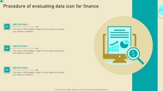 Presenting Procedure Of Evaluating Data Icon For Finance Diagrams PDF to dispense important information. This template comprises three stages. It also presents valuable insights into the topics including Procedure Of Evaluating Data, Icon For Finance. This is a completely customizable PowerPoint theme that can be put to use immediately. So, download it and address the topic impactfully.