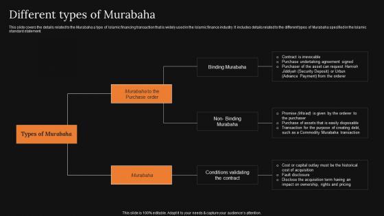 This slide covers the different forms of Islamic banking, also known as Shariah compliant banking. It also includes details related to the Murabaha, Ijarah, Istisnaa, Mudarabah, Musharaka, and Tawarooq. Coming up with a presentation necessitates that the majority of the effort goes into the content and the message you intend to convey. The visuals of a PowerPoint presentation can only be effective if it supplements and supports the story that is being told. Keeping this in mind our experts created Types Of Islamic Banking And Finance A Detailed Knowledge Of Islamic Finance Diagrams Pdf to reduce the time that goes into designing the presentation. This way, you can concentrate on the message while our designers take care of providing you with the right template for the situation. This slide covers the different forms of Islamic banking, also known as Shariah compliant banking. It also includes details related to the Murabaha, Ijarah, Istisnaa, Mudarabah, Musharaka, and Tawarooq.