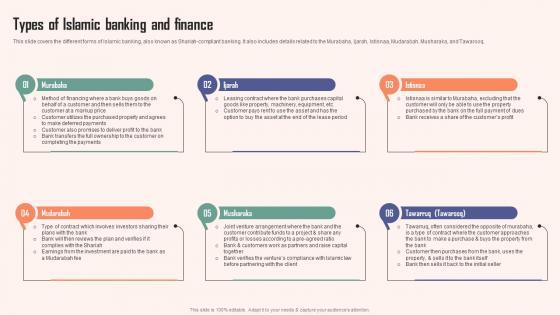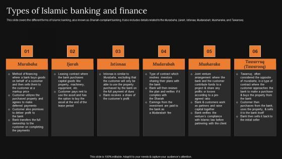 This slide covers the different forms of Islamic banking, also known as Shariah-compliant banking. It also includes details related to the Murabaha, Ijarah, Istisnaa, Mudarabah, Musharaka, and Tawarooq. This modern and well-arranged Types Of Islamic Banking And Finance Comprehensive Guide Islamic Structure PDF provides lots of creative possibilities. It is very simple to customize and edit with the Powerpoint Software. Just drag and drop your pictures into the shapes. All facets of this template can be edited with Powerpoint, no extra software is necessary. Add your own material, put your images in the places assigned for them, adjust the colors, and then you can show your slides to the world, with an animated slide included. This slide covers the different forms of Islamic banking, also known as Shariah-compliant banking. It also includes details related to the Murabaha, Ijarah, Istisnaa, Mudarabah, Musharaka, and Tawarooq.