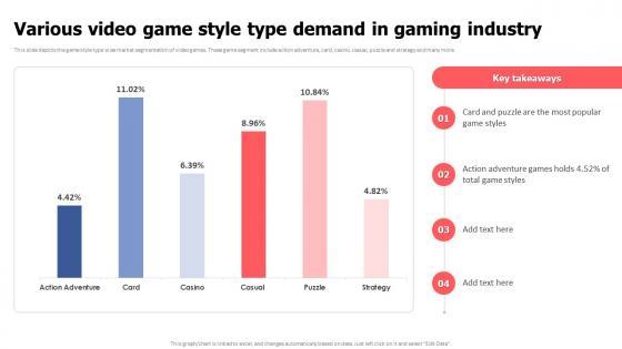 This slide depicts the game style type wise market segmentation of video games. These game segment include action adventure, card, casino, casual, puzzle and strategy and many more. Explore a selection of the finest Various Video Game Style Type Demand In Gaming Industry Video Game Financing Pitch Deck here. With a plethora of professionally designed and pre made slide templates, you can quickly and easily find the right one for your upcoming presentation. You can use our Various Video Game Style Type Demand In Gaming Industry Video Game Financing Pitch Deck to effectively convey your message to a wider audience. Slidegeeks has done a lot of research before preparing these presentation templates. The content can be personalized and the slides are highly editable. Grab templates today from Slidegeeks. This slide depicts the game style type wise market segmentation of video games. These game segment include action adventure, card, casino, casual, puzzle and strategy and many more.
