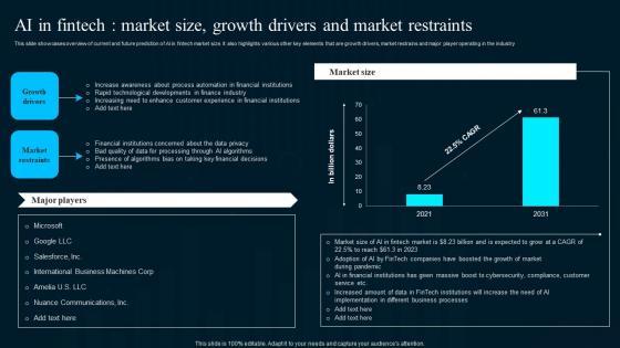 This slide showcases overview of current and future prediction of AI in fintech market size. It also highlights various other key elements that are growth drivers, market restrains and major player operating in the industry.Retrieve professionally designed Artificial Intelligence Applications Ai In Fintech Market Size Growth Drivers Professional Pdf to effectively convey your message and captivate your listeners. Save time by selecting pre-made slideshows that are appropriate for various topics, from business to educational purposes. These themes come in many different styles, from creative to corporate, and all of them are easily adjustable and can be edited quickly. Access them as PowerPoint templates or as Google Slides themes. You do not have to go on a hunt for the perfect presentation because Slidegeeks got you covered from everywhere. This slide showcases overview of current and future prediction of AI in fintech market size. It also highlights various other key elements that are growth drivers, market restrains and major player operating in the industry.