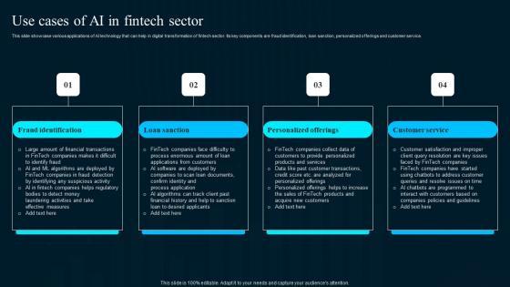 This slide showcase various applications of AI technology that can help in digital transformation of fintech sector. Its key components are fraud identification, loan sanction, personalized offerings and customer service.Explore a selection of the finest Use Cases Of Ai In Fintech Sector Artificial Intelligence Applications Ideas Pdf here. With a plethora of professionally designed and pre-made slide templates, you can quickly and easily find the right one for your upcoming presentation. You can use our Use Cases Of Ai In Fintech Sector Artificial Intelligence Applications Ideas Pdf to effectively convey your message to a wider audience. Slidegeeks has done a lot of research before preparing these presentation templates. The content can be personalized and the slides are highly editable. Grab templates today from Slidegeeks. This slide showcase various applications of AI technology that can help in digital transformation of fintech sector. Its key components are fraud identification, loan sanction, personalized offerings and customer service.