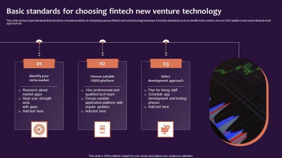 This slide shows major standards that should be considered at time of scheduling various fintech start-up technological phases. It include standards such as identify niche market, choose UXUI platform and select development approach etc. Pitch your topic with ease and precision using this Basic Standards For Choosing Fintech New Venture Technology Clipart Pdf. This layout presents information on Niche Market, Choose Suitable, Select Development Approach. It is also available for immediate download and adjustment. So, changes can be made in the color, design, graphics or any other component to create a unique layout. This slide shows major standards that should be considered at time of scheduling various fintech start-up technological phases. It include standards such as identify niche market, choose UXUI platform and select development approach etc.
