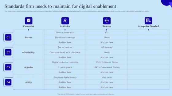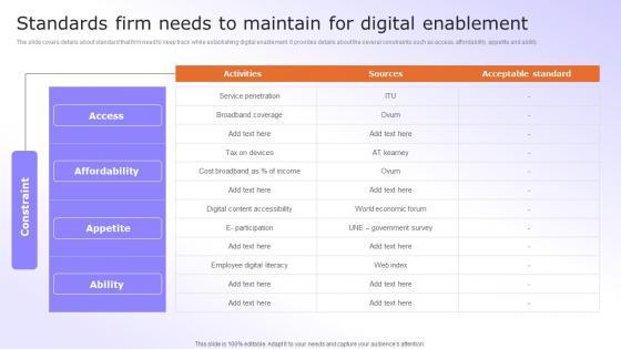 The slide covers details about standard that firm need to keep track while establishing digital enablement. It provides details about the several constraints such as access, affordability, appetite and ability. Welcome to our selection of the Standards Firm Needs To Maintain For Organisational Digital Innovation Slides PDF. These are designed to help you showcase your creativity and bring your sphere to life. Planning and Innovation are essential for any business that is just starting out. This collection contains the designs that you need for your everyday presentations. All of our PowerPoints are 100 percent editable, so you can customize them to suit your needs. This multi-purpose template can be used in various situations. Grab these presentation templates today The slide covers details about standard that firm need to keep track while establishing digital enablement. It provides details about the several constraints such as access, affordability, appetite and ability.