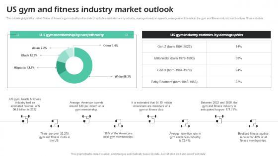 This slide highlights the United States of America gym industry outlook which includes market share by industry, average American spends, average retention rate in the gym and fitness industry and boutique fitness studios. Do you have to make sure that everyone on your team knows about any specific topic I yes, then you should give Us Gym And Fitness Industry Market Outlook Fitness Center Business Plan Download Pdf a try. Our experts have put a lot of knowledge and effort into creating this impeccable Us Gym And Fitness Industry Market Outlook Fitness Center Business Plan Download Pdf You can use this template for your upcoming presentations, as the slides are perfect to represent even the tiniest detail. You can download these templates from the Slidegeeks website and these are easy to edit. So grab these today. This slide highlights the United States of America gym industry outlook which includes market share by industry, average American spends, average retention rate in the gym and fitness industry and boutique fitness studios.