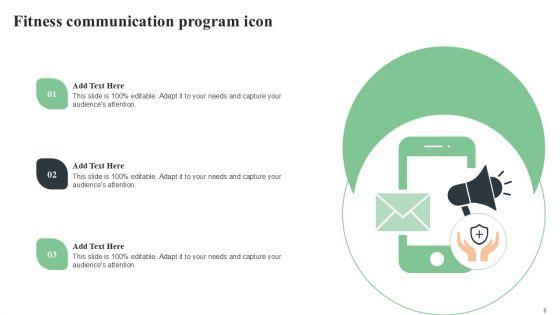 Boost your confidence and team morale with this well-structured Fitness Communication Program Ppt PowerPoint Presentation Complete Deck With Slides. This prefabricated set gives a voice to your presentation because of its well-researched content and graphics. Our experts have added all the components very carefully, thus helping you deliver great presentations with a single click. Not only that, it contains a set of nine slides that are designed using the right visuals, graphics, etc. Various topics can be discussed, and effective brainstorming sessions can be conducted using the wide variety of slides added in this complete deck. Apart from this, our PPT design contains clear instructions to help you restructure your presentations and create multiple variations. The color, format, design anything can be modified as deemed fit by the user. Not only this, it is available for immediate download. So, grab it now.