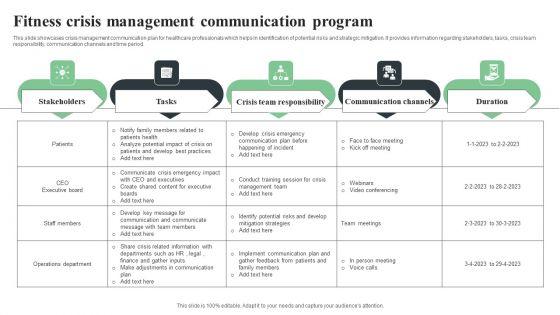 This slide showcases crisis management communication plan for healthcare professionals which helps in identification of potential risks and strategic mitigation. It provides information regarding stakeholders, tasks, crisis team responsibility, communication channels and time period. Showcasing this set of slides titled Fitness Crisis Management Communication Program Guidelines PDF. The topics addressed in these templates are Stakeholders, Tasks, Crisis Team Responsibility, Communication Channels, Duration. All the content presented in this PPT design is completely editable. Download it and make adjustments in color, background, font etc. as per your unique business setting.