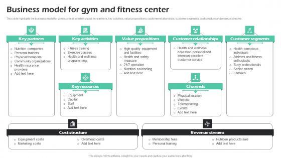 This slide highlights the business model for gym business which includes key partners, key activities, value propositions, customer relationships, customer segments, cost structure and revenue streams. From laying roadmaps to briefing everything in detail, our templates are perfect for you. You can set the stage with your presentation slides. All you have to do is download these easy-to-edit and customizable templates. Business Model For Gym And Fitness Center Fitness Center Business Plan Slides Pdf will help you deliver an outstanding performance that everyone would remember and praise you for. Do download this presentation today. This slide highlights the business model for gym business which includes key partners, key activities, value propositions, customer relationships, customer segments, cost structure and revenue streams.