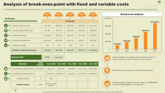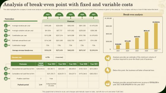 The slide highlights the companys break-even analysis. An estimate of the least amount of revenue needed to pay the fixed costs of the business is given by this analysis. The company will incur a loss if it falls below this level. Boost your pitch with our creative Analysis Of Break Even Point With Fixed And Variable Costs Landscaping Business Plan Ppt Sample BP SS V Deliver an awe-inspiring pitch that will mesmerize everyone. Using these presentation templates you will surely catch everyones attention. You can browse the ppts collection on our website. We have researchers who are experts at creating the right content for the templates. So you do not have to invest time in any additional work. Just grab the template now and use them. The slide highlights the companys break-even analysis. An estimate of the least amount of revenue needed to pay the fixed costs of the business is given by this analysis. The company will incur a loss if it falls below this level.