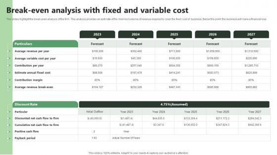 The slides highlight the break-even analysis of the firm. This analysis provides an estimate of the minimum volume of revenue required to cover the fixed cost of business. Below this point, the business will make a financial loss. Create an editable Sample Trugreen Business Plan Break Even Analysis With Fixed And Variable Cost BP SS V that communicates your idea and engages your audience. Whether you are presenting a business or an educational presentation, pre-designed presentation templates help save time. Sample Trugreen Business Plan Break Even Analysis With Fixed And Variable Cost BP SS V is highly customizable and very easy to edit, covering many different styles from creative to business presentations. Slidegeeks has creative team members who have crafted amazing templates. So, go and get them without any delay. The slides highlight the break-even analysis of the firm. This analysis provides an estimate of the minimum volume of revenue required to cover the fixed cost of business. Below this point, the business will make a financial loss.