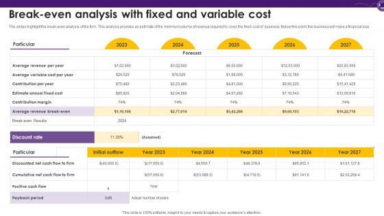 The slides highlight the break-even analysis of the firm. This analysis provides an estimate of the minimum volume of revenue required to cover the fixed cost of business. Below this point, the business will make a financial loss. If your project calls for a presentation, then Slidegeeks is your go-to partner because we have professionally designed, easy-to-edit templates that are perfect for any presentation. After downloading, you can easily edit Break Even Analysis With Fixed And Variable Cost Real Estate Renovation Brochure Pdf and make the changes accordingly. You can rearrange slides or fill them with different images. Check out all the handy templates The slides highlight the break-even analysis of the firm. This analysis provides an estimate of the minimum volume of revenue required to cover the fixed cost of business. Below this point, the business will make a financial loss.