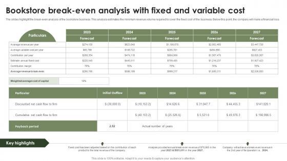 The slides highlight the break-even analysis of the bookstore business. This analysis estimates the minimum revenue volume required to cover the fixed cost of the business. Below this point, the company will make a financial loss. Slidegeeks is one of the best resources for PowerPoint templates. You can download easily and regulate Online Bookstore Business Plan Bookstore Break Even Analysis With Fixed And Variable Cost BP SS V for your personal presentations from our wonderful collection. A few clicks is all it takes to discover and get the most relevant and appropriate templates. Use our Templates to add a unique zing and appeal to your presentation and meetings. All the slides are easy to edit and you can use them even for advertisement purposes. The slides highlight the break-even analysis of the bookstore business. This analysis estimates the minimum revenue volume required to cover the fixed cost of the business. Below this point, the company will make a financial loss.