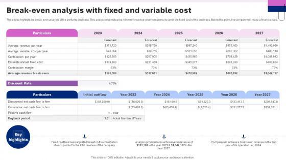 The slides highlight the break-even analysis of the perfume business. This analysis estimates the minimum revenue volume required to cover the fixed cost of the business. Below this point, the company will make a financial loss. Slidegeeks is one of the best resources for PowerPoint templates. You can download easily and regulate Perfume Manufacturing Business Plan Break Even Analysis With Fixed And Variable Cost BP SS V for your personal presentations from our wonderful collection. A few clicks is all it takes to discover and get the most relevant and appropriate templates. Use our Templates to add a unique zing and appeal to your presentation and meetings. All the slides are easy to edit and you can use them even for advertisement purposes. The slides highlight the break-even analysis of the perfume business. This analysis estimates the minimum revenue volume required to cover the fixed cost of the business. Below this point, the company will make a financial loss.