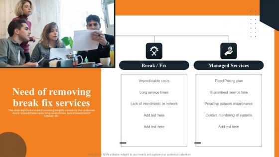 This slide depicts the need of removing break fix services to the customers due to unpredictable costs, long service times, lack of investment in network, etc. Retrieve professionally designed Per Device Pricing Strategy For Managed Solutions Need Of Removing Break Fix Services Designs PDF to effectively convey your message and captivate your listeners. Save time by selecting pre made slideshows that are appropriate for various topics, from business to educational purposes. These themes come in many different styles, from creative to corporate, and all of them are easily adjustable and can be edited quickly. Access them as PowerPoint templates or as Google Slides themes. You do not have to go on a hunt for the perfect presentation because Slidegeeks got you covered from everywhere.