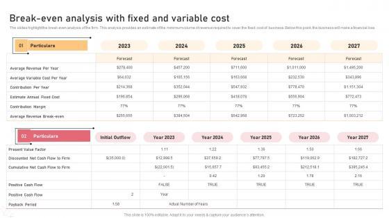 The slides highlight the break-even analysis of the firm. This analysis provides an estimate of the minimum volume of revenue required to cover the fixed cost of business. Below this point, the business will make a financial loss. Slidegeeks is one of the best resources for PowerPoint templates. You can download easily and regulate Break Even Analysis With Fixed And Variable Cost Cultural Travel Agency Business Plan Structure Pdf for your personal presentations from our wonderful collection. A few clicks is all it takes to discover and get the most relevant and appropriate templates. Use our Templates to add a unique zing and appeal to your presentation and meetings. All the slides are easy to edit and you can use them even for advertisement purposes. The slides highlight the break even analysis of the firm. This analysis provides an estimate of the minimum volume of revenue required to cover the fixed cost of business. Below this point, the business will make a financial loss.