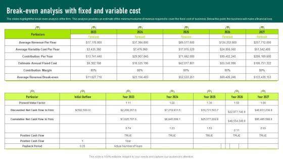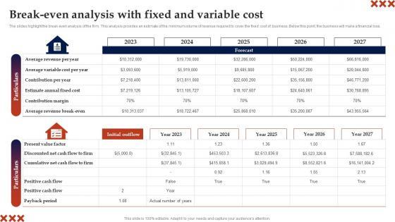 The slides highlight the break-even analysis of the firm. This analysis provides an estimate of the minimum volume of revenue required to cover the fixed cost of business. Below this point, the business will make a financial loss. Find a pre designed and impeccable Break Even Analysis With Fixed And Variable Cost Inspiration PDF. The templates can ace your presentation without additional effort. You can download these easy to edit presentation templates to make your presentation stand out from others. So, what are you waiting for Download the template from Slidegeeks today and give a unique touch to your presentation.
