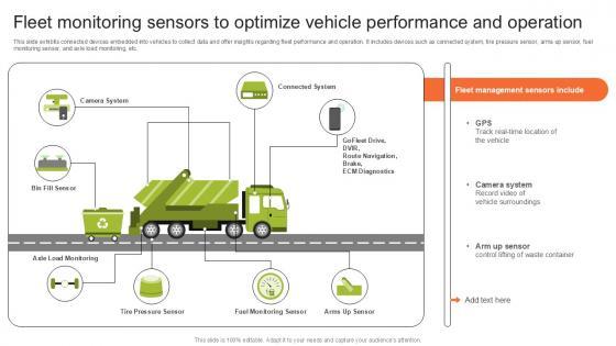 This slide exhibits connected devices embedded into vehicles to collect data and offer insights regarding fleet performance and operation. It includes devices such as connected system, tire pressure sensor, arms up sensor, fuel monitoring sensor, and axle load monitoring, etc. Do you have an important presentation coming up Are you looking for something that will make your presentation stand out from the rest Look no further than Fleet Monitoring Sensors To Optimize Vehicle Performance And Implementation Of E Waste Guidelines. With our professional designs, you can trust that your presentation will pop and make delivering it a smooth process. And with Slidegeeks, you can trust that your presentation will be unique and memorable. So why wait Grab Fleet Monitoring Sensors To Optimize Vehicle Performance And Implementation Of E Waste Guidelines today and make your presentation stand out from the rest This slide exhibits connected devices embedded into vehicles to collect data and offer insights regarding fleet performance and operation. It includes devices such as connected system, tire pressure sensor, arms up sensor, fuel monitoring sensor, and axle load monitoring, etc.