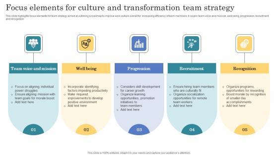 This slide highlights focus elements for team strategy aimed at outlining a roadmap to improve work culture overall for increasing efficiency of team members. It covers team voice and mission, well being, progression, recruitment and recognition Showcasing this set of slides titled Focus Elements For Culture And Transformation Team Strategy Microsoft Pdf. The topics addressed in these templates are Progression, Recruitment, Recognition . All the content presented in this PPT design is completely editable. Download it and make adjustments in color, background, font etc. as per your unique business setting. This slide highlights focus elements for team strategy aimed at outlining a roadmap to improve work culture overall for increasing efficiency of team members. It covers team voice and mission, well being, progression, recruitment and recognition