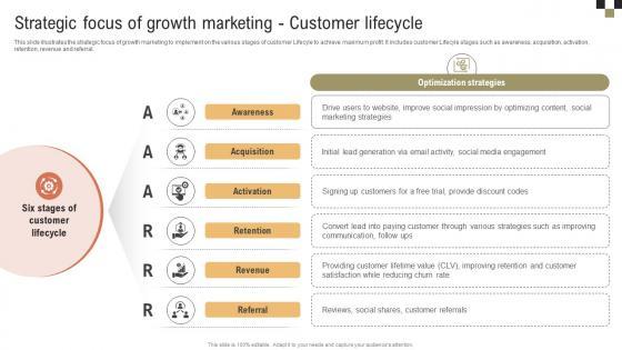 This slide illustrates the strategic focus of growth marketing to implement on the various stages of customer Lifecyle to achieve maximum profit. It includes customer Lifecyle stages such as awareness, acquisition, activation, retention, revenue and referral. Explore a selection of the finest A Comprehensive Guide On Strategic Focus Of Growth Marketing Customer MKT SS V here. With a plethora of professionally designed and pre-made slide templates, you can quickly and easily find the right one for your upcoming presentation. You can use our A Comprehensive Guide On Strategic Focus Of Growth Marketing Customer MKT SS V to effectively convey your message to a wider audience. Slidegeeks has done a lot of research before preparing these presentation templates. The content can be personalized and the slides are highly editable. Grab templates today from Slidegeeks. This slide illustrates the strategic focus of growth marketing to implement on the various stages of customer Lifecyle to achieve maximum profit. It includes customer Lifecyle stages such as awareness, acquisition, activation, retention, revenue and referral.