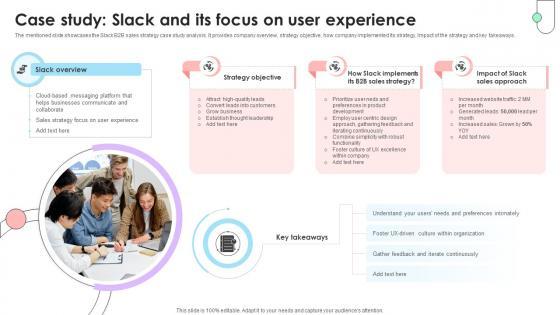 The mentioned slide showcases the Slack B2B sales strategy case study analysis. It provides company overview, strategy objective, how company implemented its strategy, Impact of the strategy and key takeaways. Make sure to capture your audiences attention in your business displays with our gratis customizable Navigating B2B Sales Case Study Slack And Its Focus On User Experience SA SS V. These are great for business strategies, office conferences, capital raising or task suggestions. If you desire to acquire more customers for your tech business and ensure they stay satisfied, create your own sales presentation with these plain slides. The mentioned slide showcases the Slack B2B sales strategy case study analysis. It provides company overview, strategy objective, how company implemented its strategy, Impact of the strategy and key takeaways.